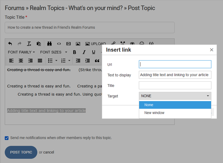 Before you are finished, you need to choose how you want your link to work. You will see "none" or "new window". I always choose "new window" so your viewers looking at your link will open your article to a new window (page/tab) rather then opening your article on the page you are on, thereby taking the member away from your post, out of Friend's Realm. You want your readers to be able to stay on your thread and open to another page for reading your article.